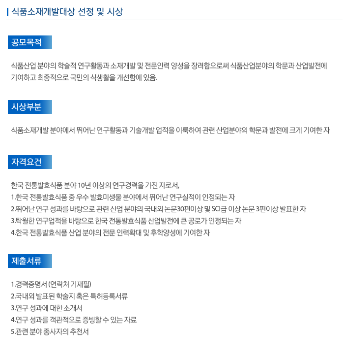 사업영역 > 식품소재개발대상 선정 및 시상